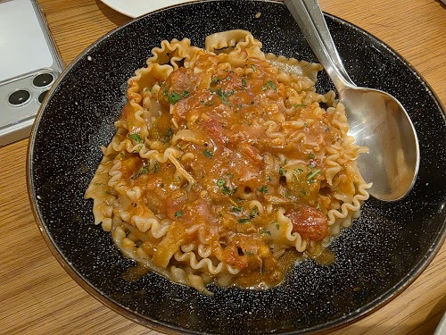 Điểm nhấn của bữa ăn chính là mỳ dẹt. Mỗi sợi mỳ, dai mềm và thấm đẫm gia vị, kết hợp hoàn hảo với các nguyên liệu kèm theo, mang đến một trải nghiệm ẩm thực đa sắc thái.