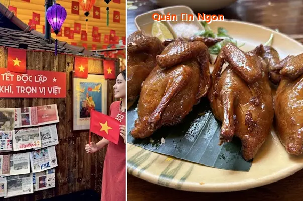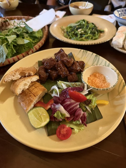 Không gian ở đây mang đậm phong cách Hà Nội xưa, từ những bộ bàn ghế gỗ, bức tường vàng, giàn hoa giấy ngoài hiên đến tiếng rì rầm trò chuyện của khách du lịch nước ngoài — tất cả hòa vào nhau, khiến bữa ăn trở thành một trải nghiệm chứ không chỉ là bữa ăn.