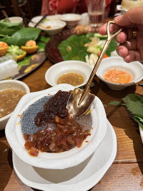4 /5 Trang Le: Thích nhất quán ở chỗ địa điểm tiện lợi, nhiều bàn, trang trí có gu. Về đồ ăn, có nhiều món từ thịt chân giò, thịt bò nhúng, các món nướng như lá lốt, bò bọc mỡ chài, cá hấp, gỏi các loại, và cả bánh xèo rồi các món chiên ăn vặt. Menu đồ uống cũng rất đa dạng các món nước dân dã như mủ chôm, nước mía, rau má. Rau cuốn cũng rất nhiều loại khác nhau, trên mâm cuốn cũng có thêm các đồ cuốn như đồ chua, khế, chuối. Nước chấm cũng có nhiều lựa chọn như mắm me.