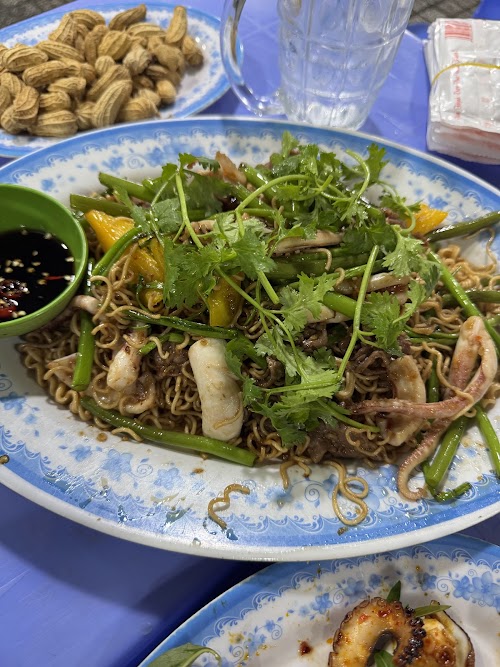 Ngoài bánh hỏi nem nướng, quán còn có bò nướng ngói – thịt mềm, ướp vừa miệng, nướng lên thơm phức, ăn kèm rau và bánh tráng cũng rất hợp vị.
