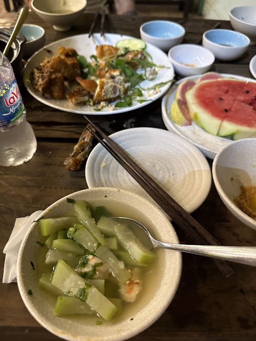 Hieu Ngo Quán hải sản view biển, có phòng hải sản nếu mọi người muốn hỏi mua kí các hải sản để mang về thì hỏi ở đó luôn. Khu vực bàn ăn bên trong có trang trí đèn led treo và đèn lồng khá xinh xắn. Đây là lần đầu gia đình mình đến ăn và gọi một số món như súp cua, nghêu xào bắp bơ, cơm chiên ghẹ, mực nướng, rau luộc kho quẹt. Theo đánh giá cá nhân thì món mực nướng mình không thích lắm vì có một số chỗ còn vết cháy ăn vào khá đắng. Cơm chiên thịt ghẹ dành cho người có nhân phẩm tốt.. để xúc trúng phần thịt ghẹ, phần cơm tơi và không bị khô, khá ngon. Phần nghêu xào bắp bơ thì anh chị mình nhận xét là khá ít sốt nên hơi thất vọng. Món súp cua rất ngon, ai cũng mê. Menu quán có rất nhiều món, chỉ chuyên hải sản, quán có bản menu 1 Trung 1 Việt, giá thành các món như nhum hay hàu thì khoảng 35k/con. Còn các món lẻ khác thì tầm 100k-200k, có cả các set/ người hay combo món.