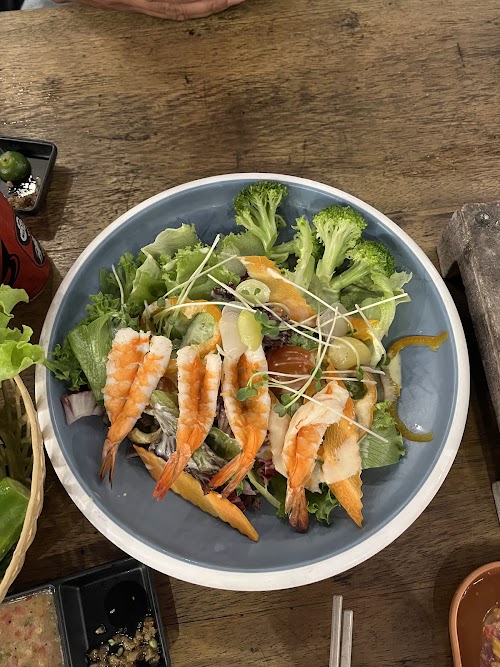 Nhà mình ít người nên chỉ gọi 1 combo thịt nướng, salad chanh dây, miến trộn bò, 1 nai nướng. Ra món hơi chậm. Nhìn chung đồ ăn khá ổn. Vì mình cũng không kỳ vọng quá nhiều cho 1 tiệm nướng có view đẹp. Miến trộn ngon nhất 100 điểm. Combo thịt ướp ăn ổn, có phần thịt cắt hơi nhỏ quá khó nướng, có kèm sốt phomai chấm thịt nướng khá bắt miệng. Còn sốt chấm khác không có gì đặc biệt. Nai nướng cũng ok, sốt không hợp lắm. Sẽ không ăn lại Salad chanh dây vì để ngoài trời bị lạnh ngắt, vị cũng khá bình thường. Gọi món ấm nóng ăn sẽ hợp hơn salad.