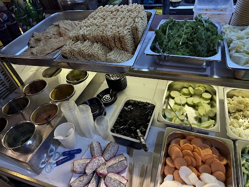 Giá vé sẽ là 99k được ăn các loại rau, nấm, mì, đậu hũ, nước uống và tráng miệng trên quầy line. Nước lẩu chọn 2 trong 7 vị nước lẩu thì mình chọn lẩu thái và lẩu chao, lẩu chao béo thơm ngon, lẩu thái thì chỉ có vị chua thôi, đậm đà thêm sẽ ngon hơn, cả 2 vị đều có sẵn các loại chả chay nha. Quầy line cũng nhiều loại rau, được che chắn cẩn thận nên cũng tươi và sạch chứ không bị héo. Nước chấm cơ bản như muối ớt xanh, đỏ, sa tế,… mà mình thấy lẩu cũng vừa ăn nên không cần chấm cũng được.